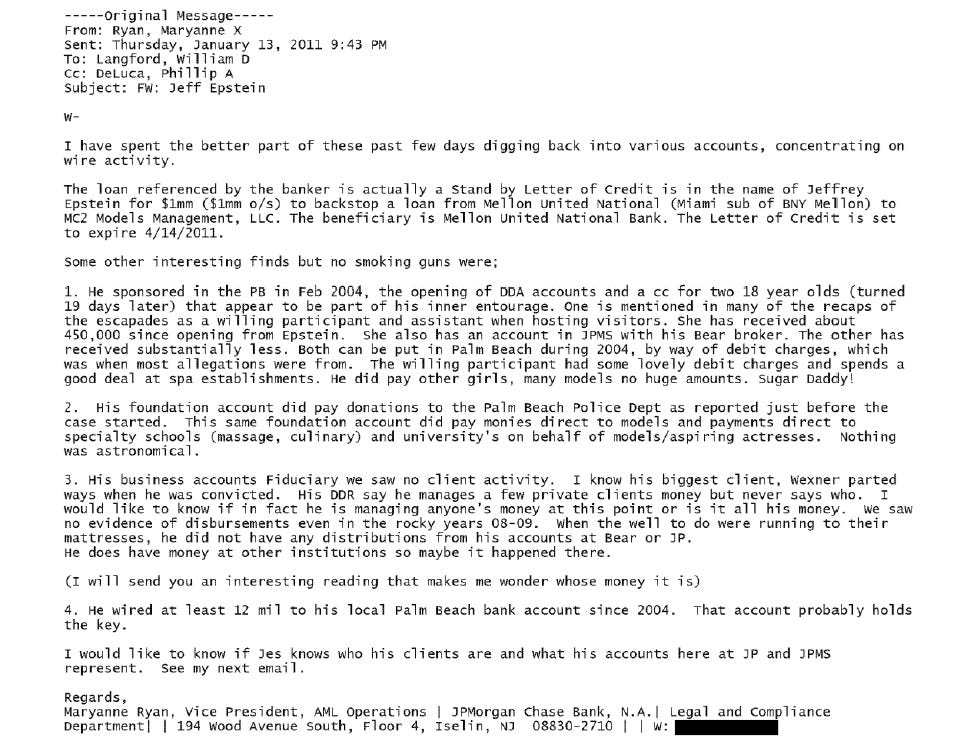 By mid‑March, Epstein appeared to sense trouble with JPMorgan. On March 11, he emailed Jes Staley to ask whether there was a problem with a letter of credit the bank had issued for his modeling agency, MC2 Model Management, LLC.