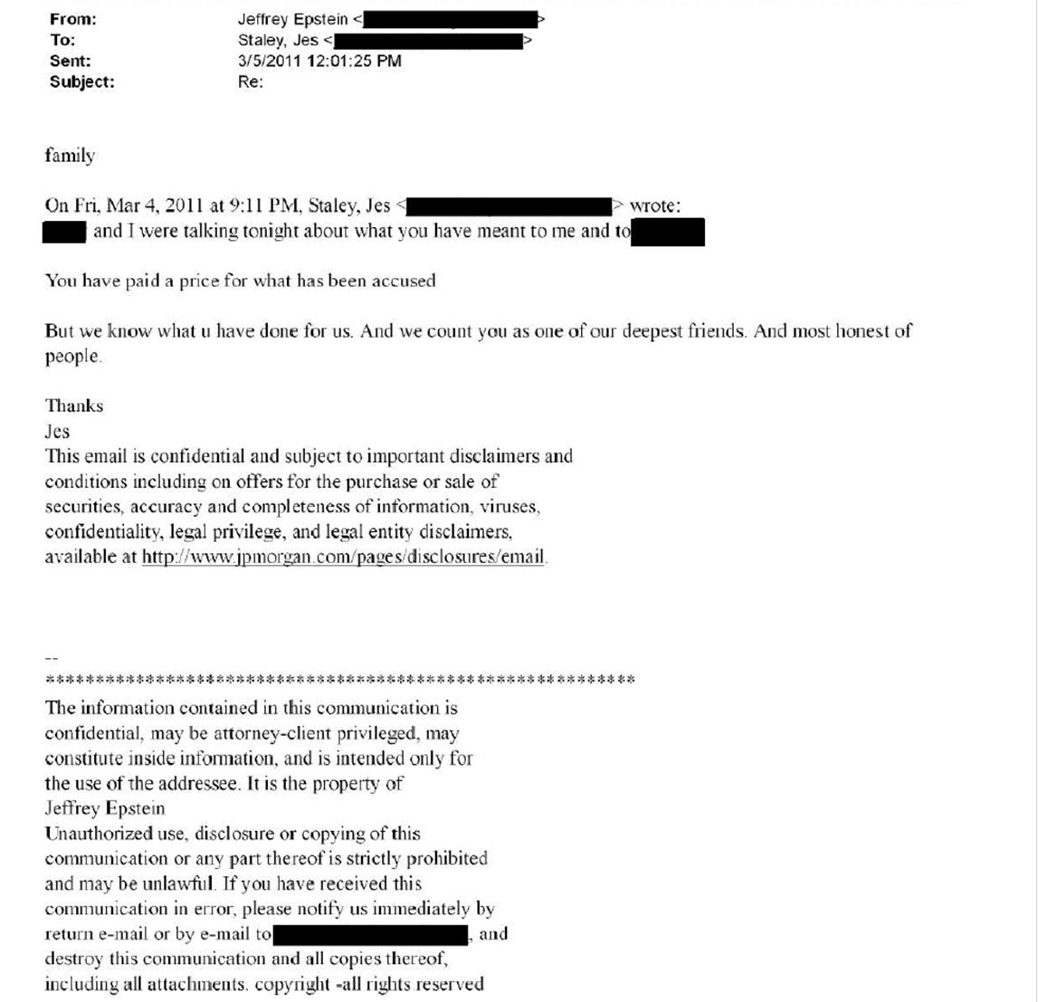 The night the Daily Mail published its Prince Andrew story, Epstein received a message from Jes Staley, his close friend and then‑CEO of JPMorgan Chase’s investment bank. Staley wrote: “You have paid a price for what you have been accused… But we know what u have done for us. And we count you as one of our deepest friends. And one of the most honest of people.”