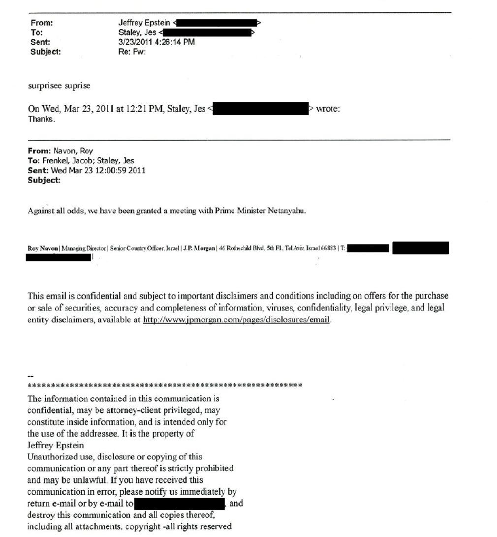 As Cutler weighed Epstein’s future as a client, the financier had one last card to play. JPMorgan executives had been pressing for a meeting with Israeli Prime Minister Benjamin Netanyahu. On March 23, Roy Navon, managing director of the bank’s Israeli branch, emailed Jes Staley: “Against all odds, we have been granted a meeting with Prime Minister Netanyahu.”