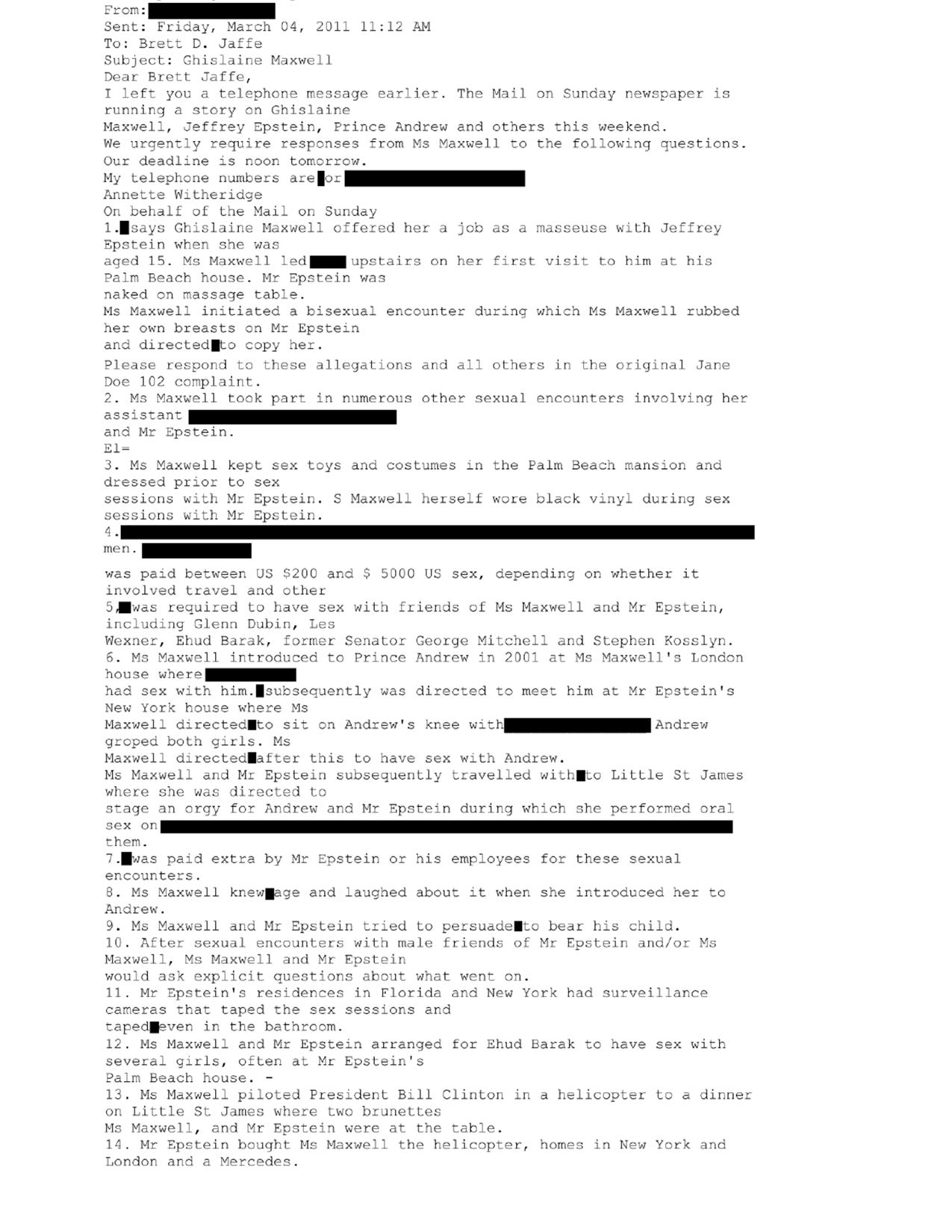Witheridge followed up with an email stating that the paper planned to run a story on Maxwell and her role in the Epstein saga. Her questions drew on the complaint in Jane Doe No. 103 v. Epstein and included allegations that Jane Doe No. 103—Giuffre—had been required by Maxwell and Epstein to have sex with several men, among them Ehud Barak.