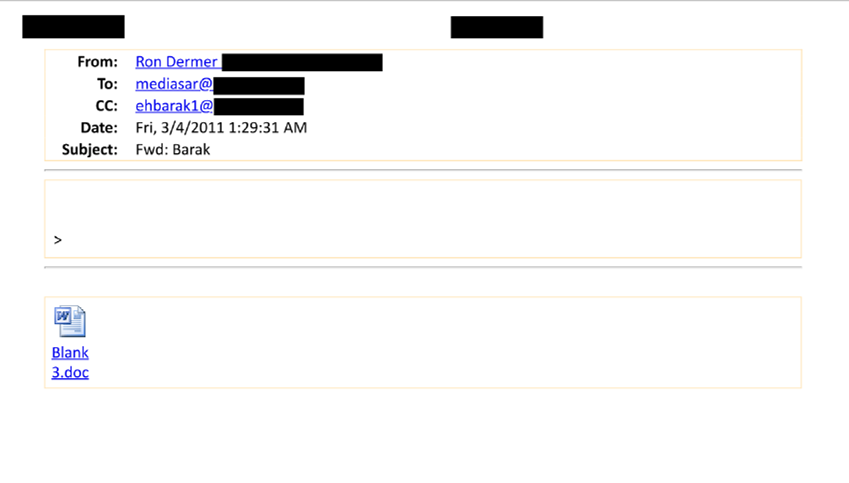 As detailed in a previous exclusive from The (b)(7)(D), Barak enlisted the help of Ron Dermer, then chief aide to Israeli Prime Minister Benjamin Netanyahu, to deflect the claims. Dermer drafted a statement that Barak’s Defense Ministry press aide passed along to the newspaper. The Mail on Sunday quoted the statement and withheld the damaging allegations about Barak.
