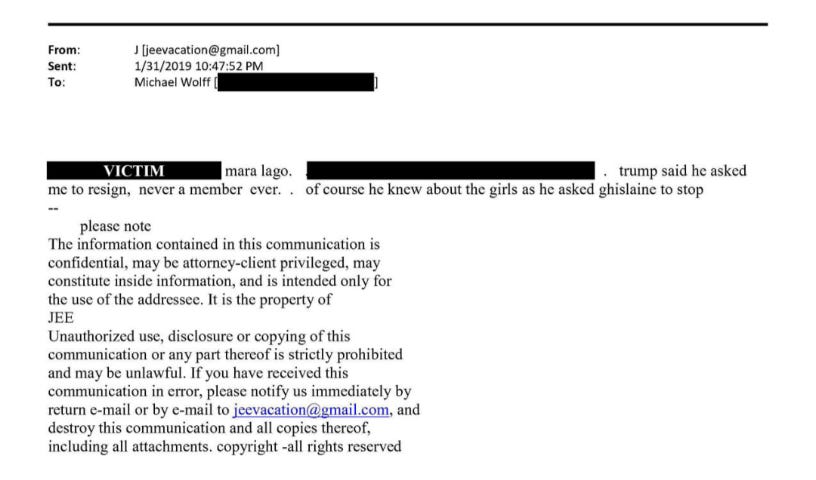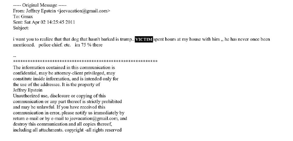 Epstein’s reaction suggests he expected the Daily Mail’s investigation to go further — and to include Donald Trump. On April 2, 2011, he emailed Ghislaine Maxwell, who was at the center of the allegations. “I want you to realize that [the] dog that hasn’t barked is [Trump],” Epstein wrote. “[Redacted Victim] spent hours at my house with him . . . he has never once been mentioned.” Maxwell responded cryptically: “I have been thinking about that . . .”